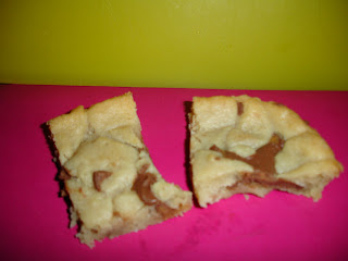 -I baked a modified version of the cookie bars that K13 posted on her blog, Someday I’ll Get There. I used Sugar cookie dough instead of peanut butter and Rolo’s candies instead of PBCups (I hate PBCups-weird, I know).